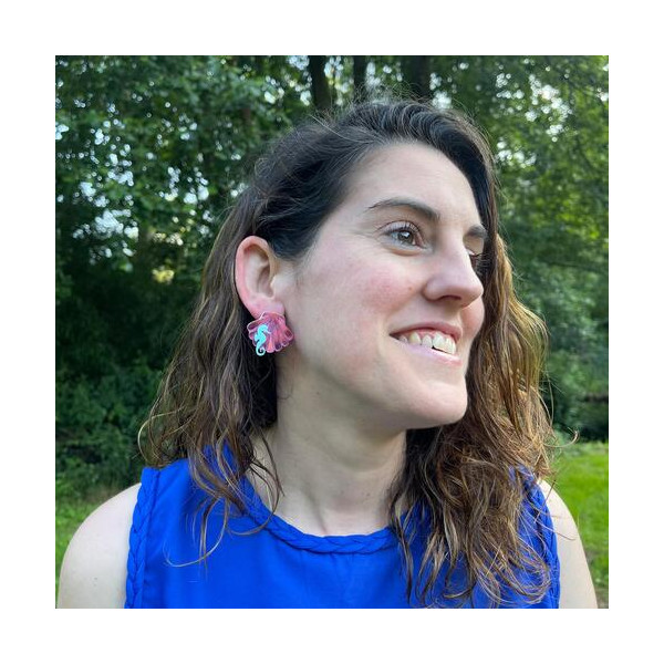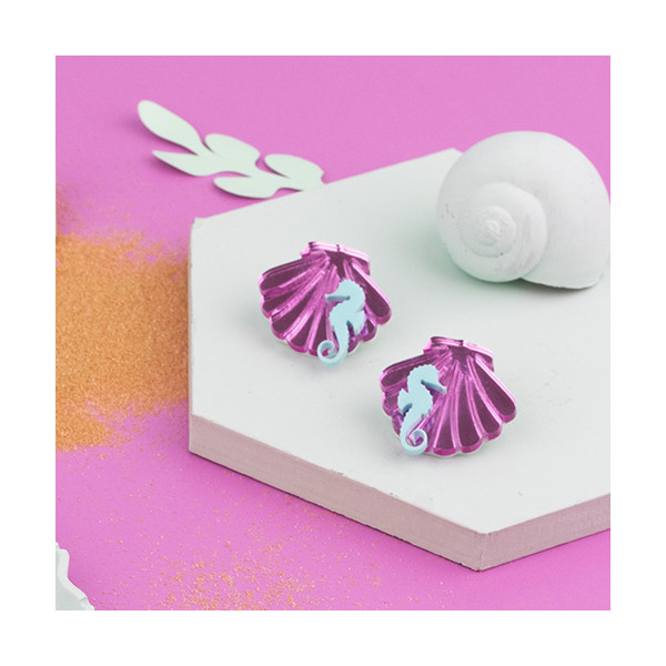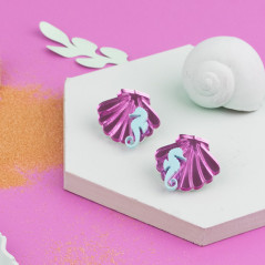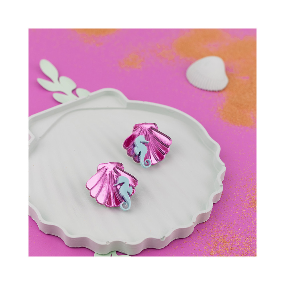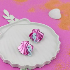 Mini caballito de mar en color azul pastel sobre concha rosa espejo. Cierre de presión en acero inoxidable hipoalergénico.