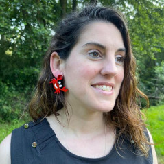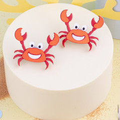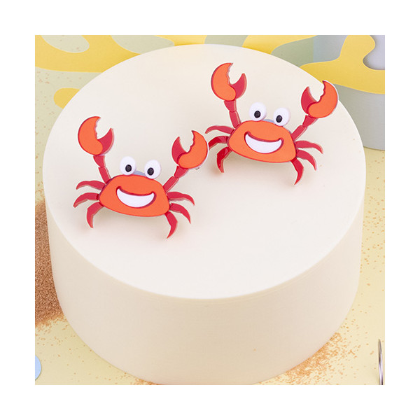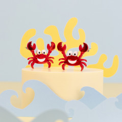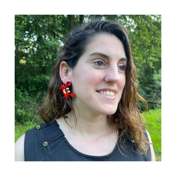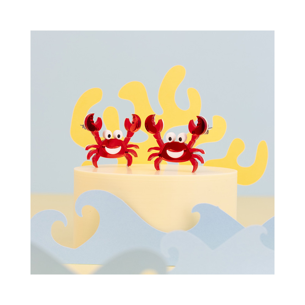 Cangrejo hecho en metacrilato rojo espejo, rojo y blanco. Cierre de presión en acero inoxidable hipoalergénico.