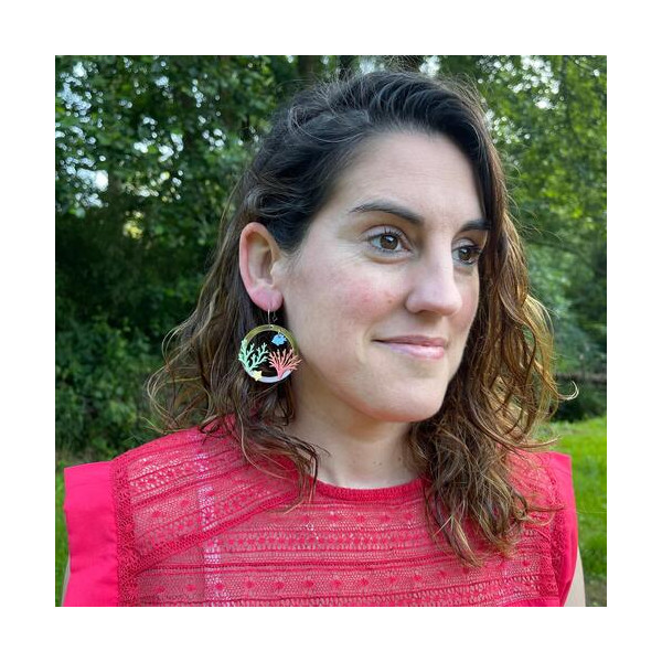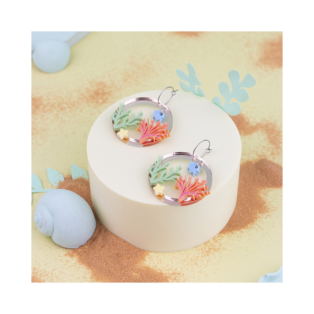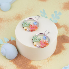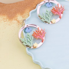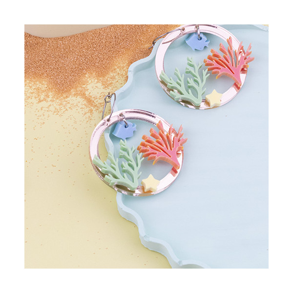 Marco circular en metacrilato espejo dorado rosa, corales y pez en verde, coral y azul pastel. Cierre aro en acero inoxidable hipoalergénico.